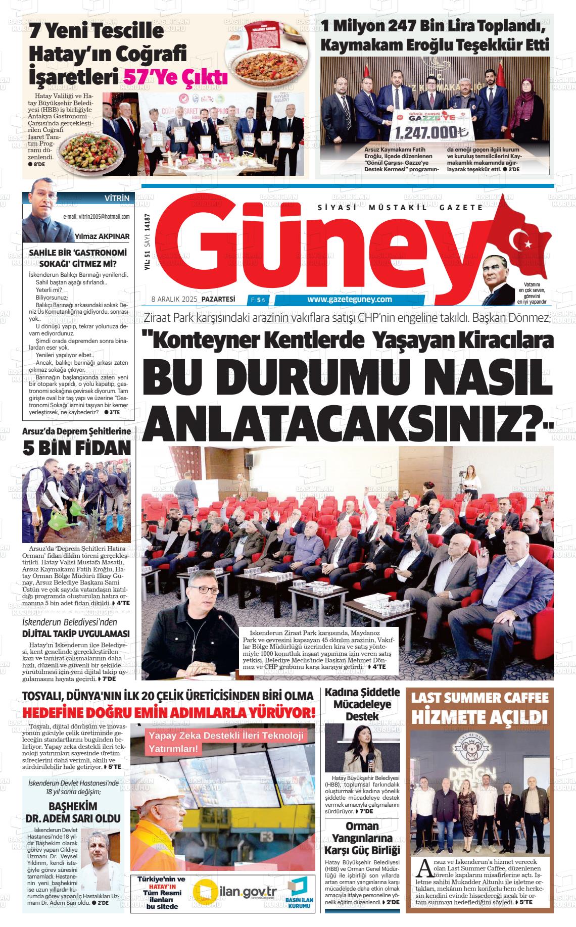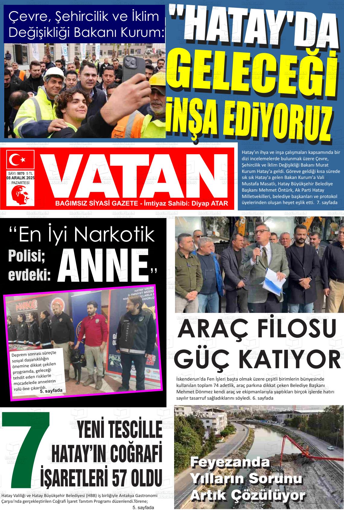 Hatay Yerel Gazeteleri 08 December 2025, Monday Günü Manşeti
