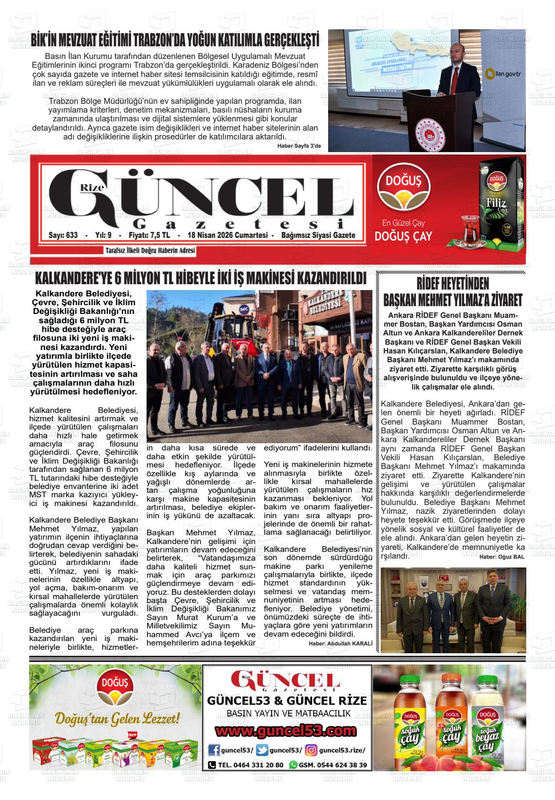 Rİze Yerel Gazeteleri 18 Nisan 2026, Cumartesi Günü Manşeti