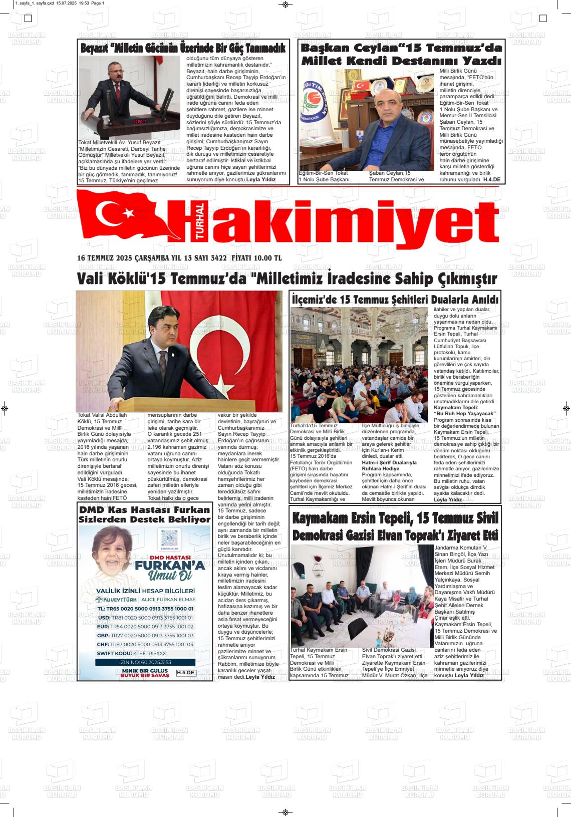 Tokat Yerel Gazeteleri 24 Ekim 2025, Cuma Günü Manşeti